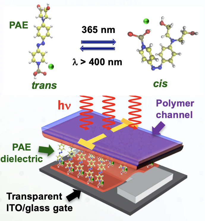 Charge transport in ultra-thin transistors strongly depends on the characteristics of the dielectric layer poised between the gate electrode and the current-conducting semiconductor channel. The current modulation scales with the capacitance, and therefore the inverse dielectric thickness, which is fixed in conventional devices. In this work, molecular self-assembly of highly polarizable PAE molecules was used to create reconfigurable dielectric layers whose capacitance changes with illumination. Upon ultraviolet optical illumination, the PAE molecules undergo a photoisomerization from an extended trans geometry to a compact cis geometry, which can be reversed upon illumination at longer wavelengths. The accompanying capacitance modulation provide new functions to optoelectronic devices. For example, the output of the photo-reconfigurable transistor depends on prior optical stimulation, combining the functionalities of logic and memory through the integration of new low-dimensional reconfigurable materials.
