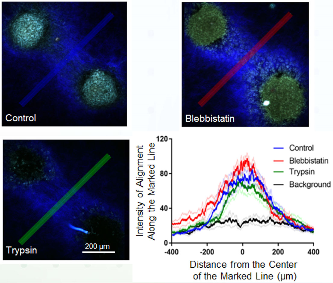 A collaboration (Wells, Shenoy) in IRG 2 studied the mechanisms of mechanical plasticity in collagen networks resulting from contractile forces produced by cellular aggregates placed within them. The Wells group used fibroblast spheroids seeded atop collagen gels to study the plasticity of collagen fiber networks due to cell-induced forces. Second harmonic generation imaging and spectral analysis enabled quantification of the alignment of fibers between a pair of contractile cell clusters. After 12 hours, dense tracts of aligned fibers were observed between nearby cell clusters. To investigate the persistence of cell-induced deformations in the collagen network, the Wells lab then abolished cellular contractility using blebbistatin and trypsin. Fiber alignment and densification persisted at the tracts, signifying plasticity of the collagen networks in the fibrous tracts. Shenoy’s group explained these using a chemomechanical fiber network model. This work verifies an IRG hypotheses that non-uniform displacements of fibers in networks under strain enables local chemical changes, e.g., new crosslink formation, that can be controlled to make new force-sensitive and force-reporting soft materials.