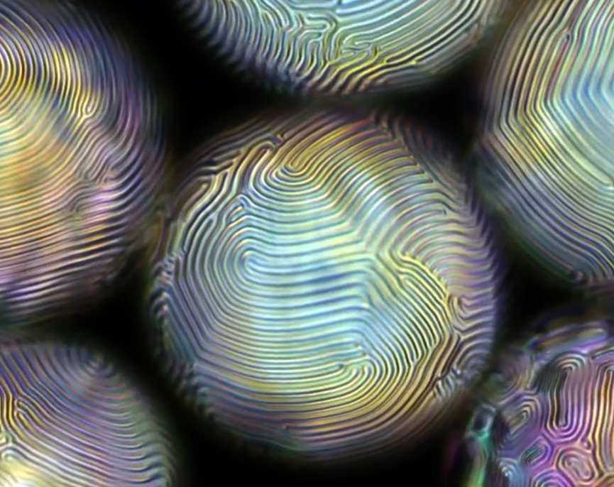 Because liquid crystals are similar to oil, “soap” molecules called surfactants are attracted to the liquid crystal shells. The concentration of surfactants affects the anchoring of the cholesteric liquid crystals (CLCs) at the shell walls, causing the CLC molecules to order in different ways and create striking patterns. The more surfactant added to the solution, the more the patterns changed. Adding water caused the patterns to reverse.