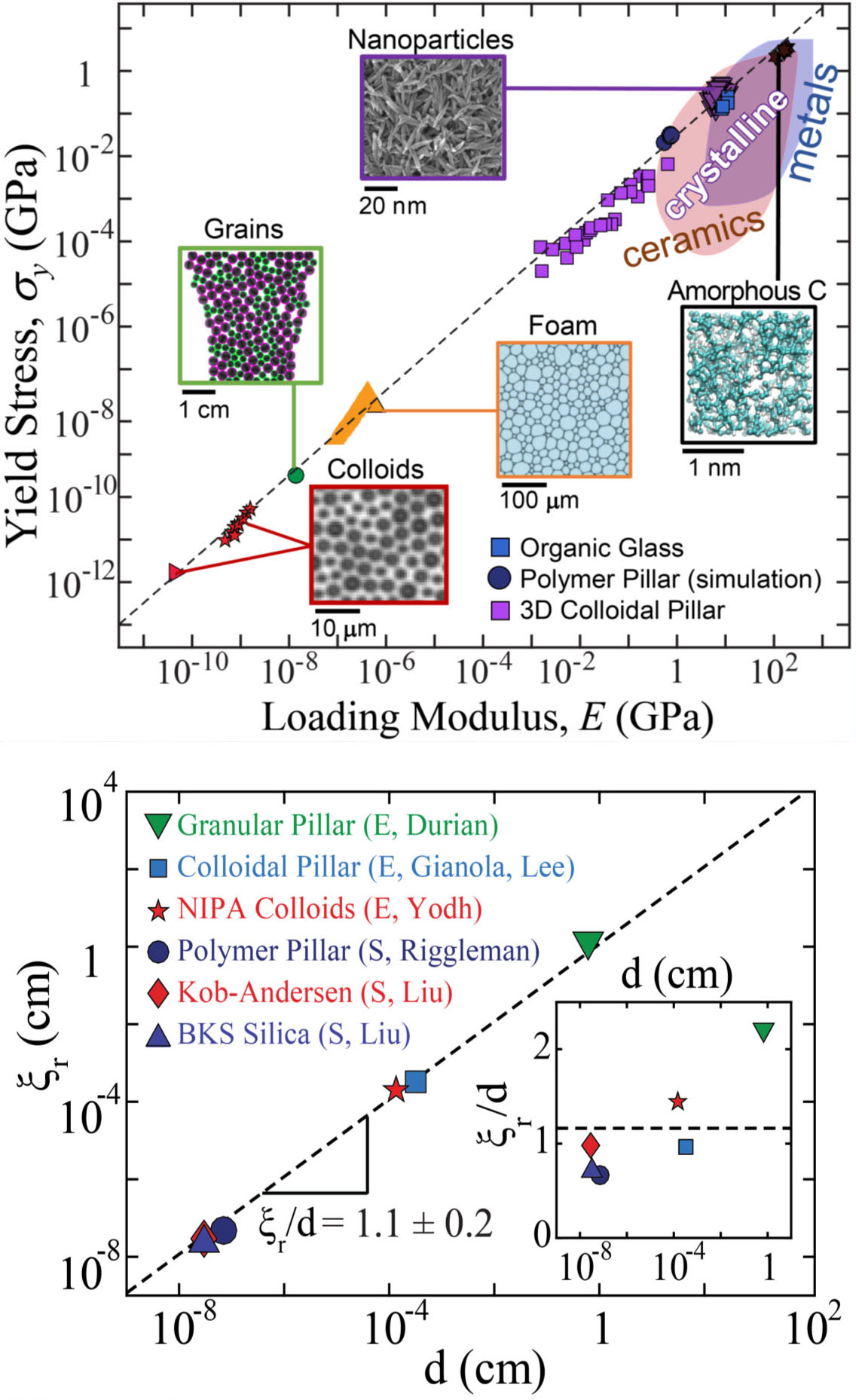 The groups of nine faculty in IRG 1 (Arratia, Carpick, Durian, Fakhraai, Lee, Riggleman, Turner, Yodh, Liu) are exploring approaches to increase the toughness of disordered materials that are otherwise prone to fail in a catastrophic, brittle fashion. Recent work shows two common indicators of toughness, related to yield-strain behavior and rearrangement size, cannot be easily changed or manipulated to increase material toughness. To further understand toughness of a variety of systems, they looked at two materials properties. First, yield stress, which is the amount of stress it takes for a material to start to deform permanently. Second, modulus, which can be thought of as a materials stiffness. Fig. 1 (top) shows yield stress vs modulus for disordered solids (IRG 1 data) and crystalline solids. Remarkably, for these vastly different materials, the yield stress is tightly distributed around 3% over 13 decades in modulus. Fig. 1 (bottom) considers the relationship between rearrangement size, i.e. how atoms or particles in a system move when the system is strained, and particle size for 6 systems (3 experimental, 3 computational) spanning nearly 7 orders of magnitude of particle size. Inset shows that the size (exponential length scale) of rearrangements is universally about one particle diameter at low strains.