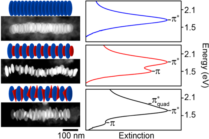 Recent advances in gold nanoparticle synthesis combined with functionalization with DNA linkers has enabled the self-assembly of stacks of gold nanodisks in which the optical spectra can be tuned and modulated by controlling the stack structure (e.g., particle spacing, arrangement, and stack length). The figure shows three possible arrangements of the particles, and the corresponding spectra that are associated with the plasmon resonance excitation in the stack. Theoretical models of both the stack structure and optical spectra provide a quantitative description of the results, including an understanding of the spectra in terms of plasmon hybridization. This work will inform ongoing efforts to realize a wide range of plasmonic applications.