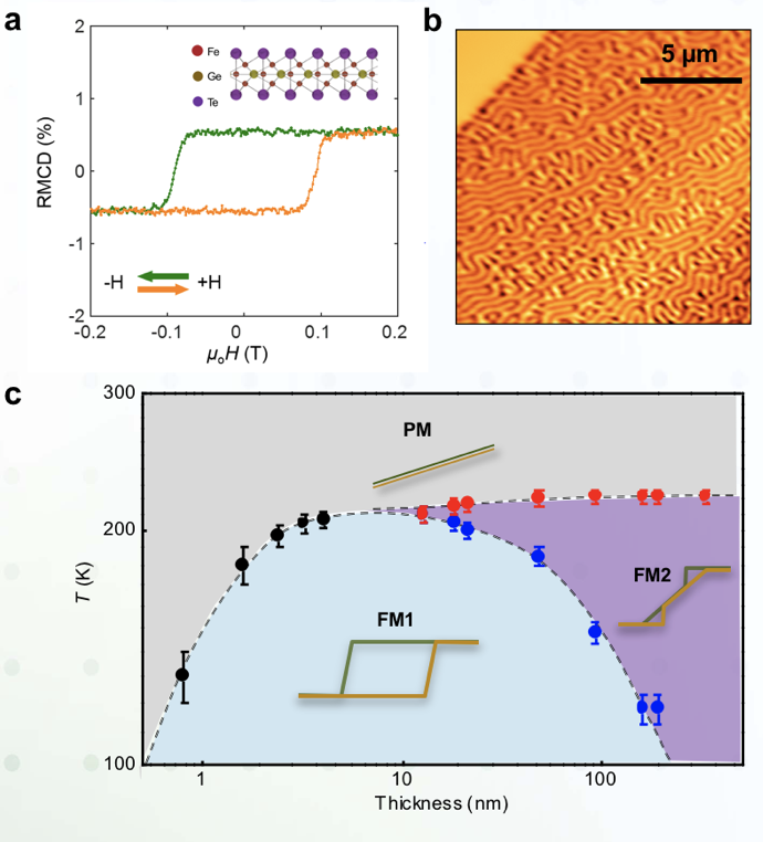 By investigating the electrical transport and optical properties of atomically thin iron germanium telluride (Fe3GeTe2), a ferromagnetic metal in the bulk form, we demonstrate that monolayer Fe3GeTe2 (~0.8 nm thick) is a robust 2D itinerant ferromagnet (Fig. 1a, hallmark of a ferromagnet), with a relatively high Curie temperature (130 K). For flakes thicker than ~15 nm, the formation of labyrinthine domain patterns (Fig. 1b) appear at intermediate temperatures, eventually becoming the predominant magnetic structure for much thicker flakes. A compiled thickness-temperature phase diagram is shown in Fig. 1c.