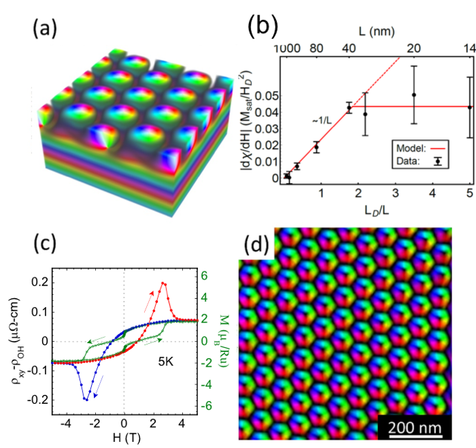 - Topological Hall effect measurements of skyrmions in FeGe thin films and novel oxide heterostructures of SrIrO3/SrRuO3.