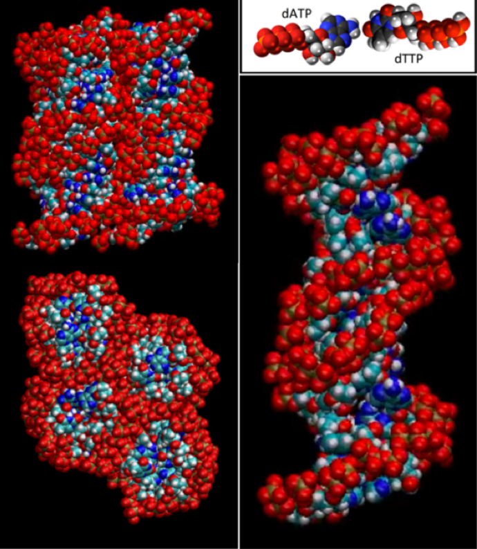But researchers in the University of Colorado, Boulder Soft Materials Research Center have found that DNA double helical ordering is also possible without the polymer chains. In the images the single DNA base monomers ATP and TTP are forming double helical stacks in a concentrated solition. The research team spaculates that this may have been key to the origin of life: the way that DNA-like molecules first appeared in the prebiotic universe.
