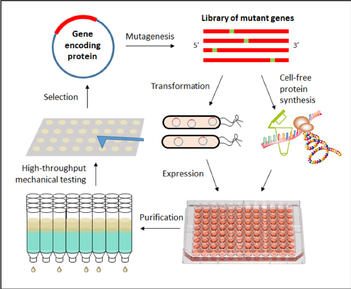 In a new seed project within the Northwestern University MRSEC, a novel approach for discovering and designing materials is being developed using directed evolution. While directed evolution approaches have been successfully applied in areas such as therapeutics or catalysis, this strategy has not been fully explored in materials science and engineering. In particular, through genetic mutation, protein expression, and high throughput materials screening, this work is applying evolutionary principles to materials design, with the initial application of engineering wet adhesion of mussel foot proteins in extreme environments. Following this proof-of-concept demonstration, this materials design approach will be generalized to other biomaterial and polymeric systems.