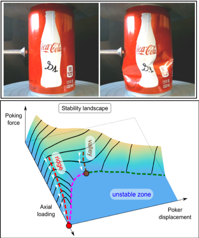Through their systematic study of the axial denting and applied forces, they were able to map out a “stability landscape,” to understand the conditions where shell cylinders will buckle from instabilities. Because of the sudden-onset effect they were able to predict the response from soda cans to a more general universal behavior for cylindrical objects. Thus, researchers can use this stability map to predict the strength of a space rocket or other similar objects to a gentle poke from the side (adapted from Katherine Wright, contributing editor for Physics).