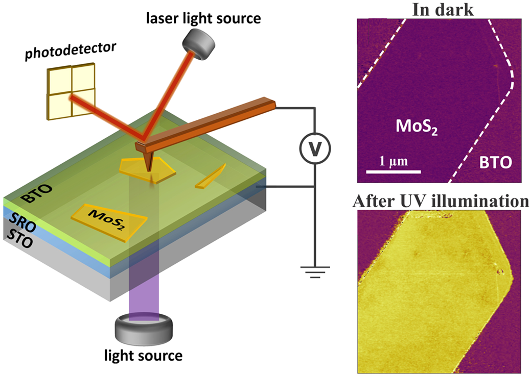 Switchable electric polarization of ferroelectric materials can serve as a state variable in advanced electronic systems, such as non-volatile memories and logic. Control of ferroelectric polarization by external stimuli is the key component for these systems. Nebraska MRSEC researchers have discovered an optical control of the hybrid structures comprising a two-dimensional (2D) semiconducting material, molybdenum disulfide (MoS2), and ultrathin ferroelectric barium titanate (BaTiO3). They showed that optical excitation of MoS2 by ultraviolet light leads to polarization reversal in the BaTiO3 film accompanied by a significant change in electric resistance of the hybrid structure. These findings reveal a great potential of the 2D semiconductor-ferroelectric structures for future nanoelectronic devices with optically controlled functionalities.