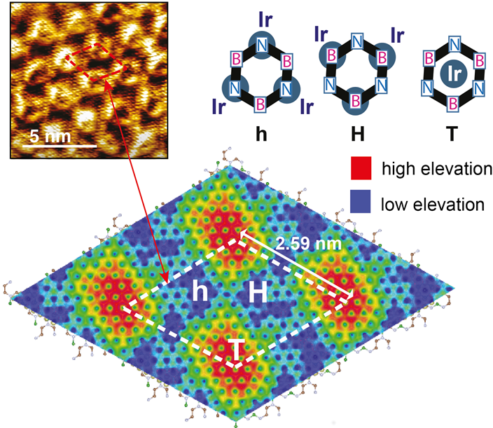 The emergence of two-dimensional (2D) materials, which are only one atom or one structural unit cell thick, has stimulated an enormous range of research effort. The well-known example is graphene – a zero band gap semiconductor, which exhibits outstanding charge carrier mobility. However, the absence of a band gap is a major hindrance in implementing graphene in 2D electronics. The question arises whether other graphenic systems of mono-atomic thickness, with useful electronic properties, can be realized. Nebraska MRSEC researchers have demonstrated that a ternary network of boron (B), carbon (C), and nitrogen (N) atoms that occupy the graphenic sites in a 2D sheet can produce the required electronic properties. They synthesized a BCN monolayer on the iridium (Ir) surface, modelled its atomic structure, and characterized its electronic properties. Thus, long predicted, the BCN material has been finally realized showing a new route to implementing 2D electronics. (S. Beniwal et al., ACS Nano 11, 2486 (2017)