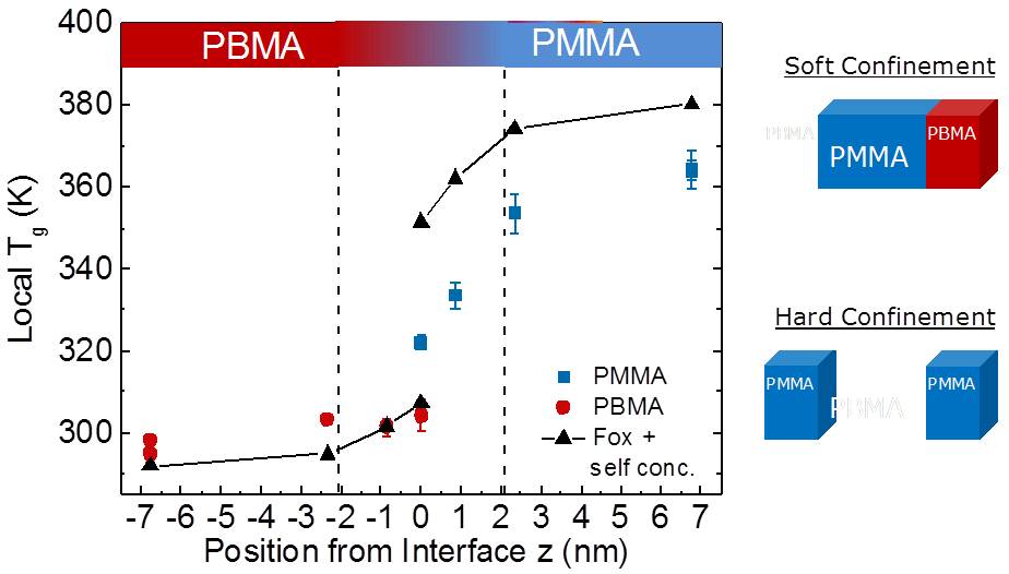Block copolymers, which self-assemble into nanostructures due to the incompatibility of each block, have generated intense scientific interest and are used in a myriad of important technologies. In such systems, the majority of the macromolecules can lie within a few nanometers of an internal interface, within a region where the dynamics and mechanical properties can be highly modified from their bulk values. The team has developed the first method to map the full distribution of dynamics at the interface and at prescribed distances away from the interface. We found that in the case of of lamella-forming diblock copolymers of poly(butyl methacrylate-b-methyl methacrylate) (PBMA-PMMA) a significant gradient in glassy dynamics existed, which had masked been all prior measurements. See Figure for snapshot of our findings.