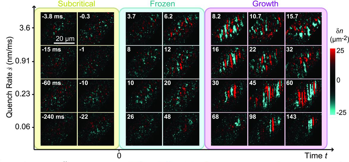 By ramping the modulation strength, the emergence and growth of the pseudo-spin fluctuations are universal in the normalized coordinate (bottom graphic, squares), and are in good agreement with theoretical calculations (bottom graph. Line).