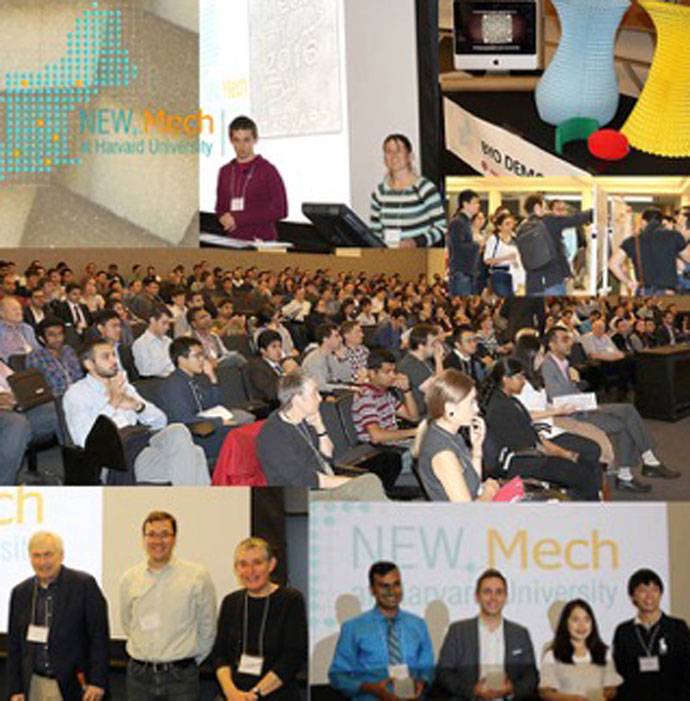 The MRSEC co-sponsored NEW.Mech, a one-day workshop held in October 2016 at Harvard. The annual conference brings together researchers to explore new directions in the mechanics of materials and structures. The workshop, organized by Katia Bertoldi and Christopher Rycroft (top center), was heavily subscribed with over 300 attendees. Invited speakers (lower left) included James Rice (Harvard), Lorna Gibson (MIT), and Ryan Hayward (UMass). The workshop also featured student sound-bite talks, poster sessions, and hands-on demonstrations. The audience voted on-site for the top, sound-bite presentations and awards were presented to those students (lower right). This annual workshop is an important community builder for researchers in mechanics in the New England region.
