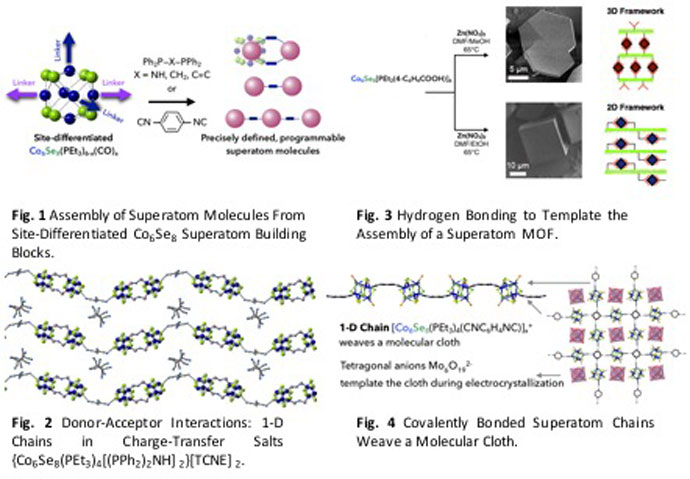 The synthesis of site-differentiated Co6Se8(PEt3)6-x(CO)x superatom building blocks (Fig. 1, Ref. 1) has facilitated the assembly and study of superatom, nano-molecules of precise arrangements and size. Precise extended nano-materials were assembled from these superatom building blocks using donor-acceptor interactions (Fig. 2), hydrogen bonding (Fig. 3) and, remarkably, covalent bonding (Fig. 4). The bulk properties (such as magnetism and conductivity) of the assembled materials are determined by the composition and dimensionality of the assembly.