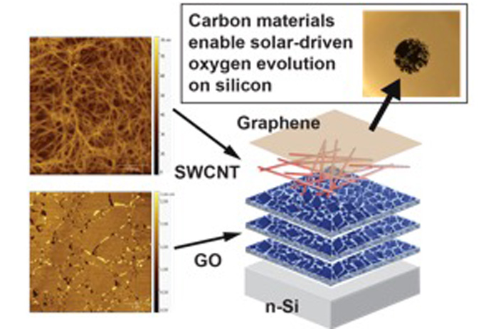 Solar water splitting converts solar energy into chemical fuels that can be easily stored and transported. Silicon is already used on a large scale for photovoltaics, but it is unstable in the electrolytes used for water oxidation. Here, graphene and carbon nanotubes, which are respectively single-atom-thick sheets and tubes of carbon, protect silicon anodes and enable water oxidation with increased efficiency. Holes, one type of excited charge carrier, are extracted from the silicon into the sorted semiconducting carbon nanotubes before loss can occur via recombination or corrosion. Unlike prior protective layers, these films contain no precious metals and can be deposited from solution under ambient conditions, providing a route towards large-scale, low-cost solar fuel production.