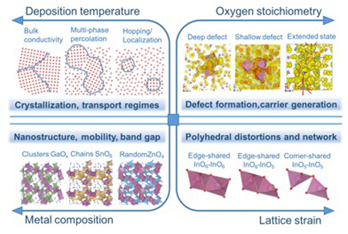 The combined results of controlled synthesis, ab-initio molecular-dynamics liquid-quench simulations, thorough structure and property characterization, and accurate density-functional calculations helped identify four major components that govern the electrical, optical, thermal, and mechanical properties of prototype In-based AOSs: (i) deposition temperature; (ii) oxygen stoichiometry; (iii) cation composition; and (iv) lattice strain, Figure.