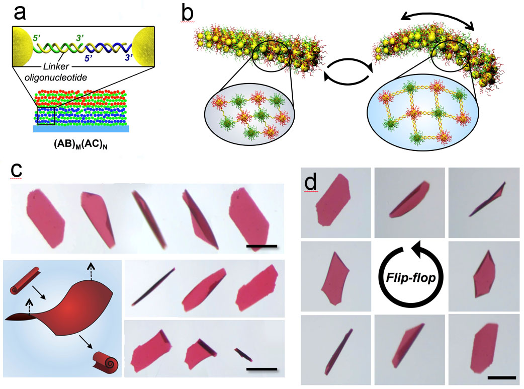 The ‘micro-origami’ approach to making microrobotic devices is to form thin films that can fold themselves into desired, dynamically transformable shapes. By combining photolithography, synthetic DNA and gold nanoparticles, MRSEC engineers created thousands of identical micromachines in water that can change their shape in seconds when commanded by the addition of other DNA strands to solution.1 These machines, by curling and uncurling themselves, could roll over synchronously in a controlled manner; such that they all faced ‘up’ or ‘down’ on command. This operation required two independently controllable types of nanoscale DNA ‘muscles’, and would have been difficult or impossible with earlier micro-origami materials. In the future, these researchers hope to build more complex and capable microrobots to interface with biological systems.