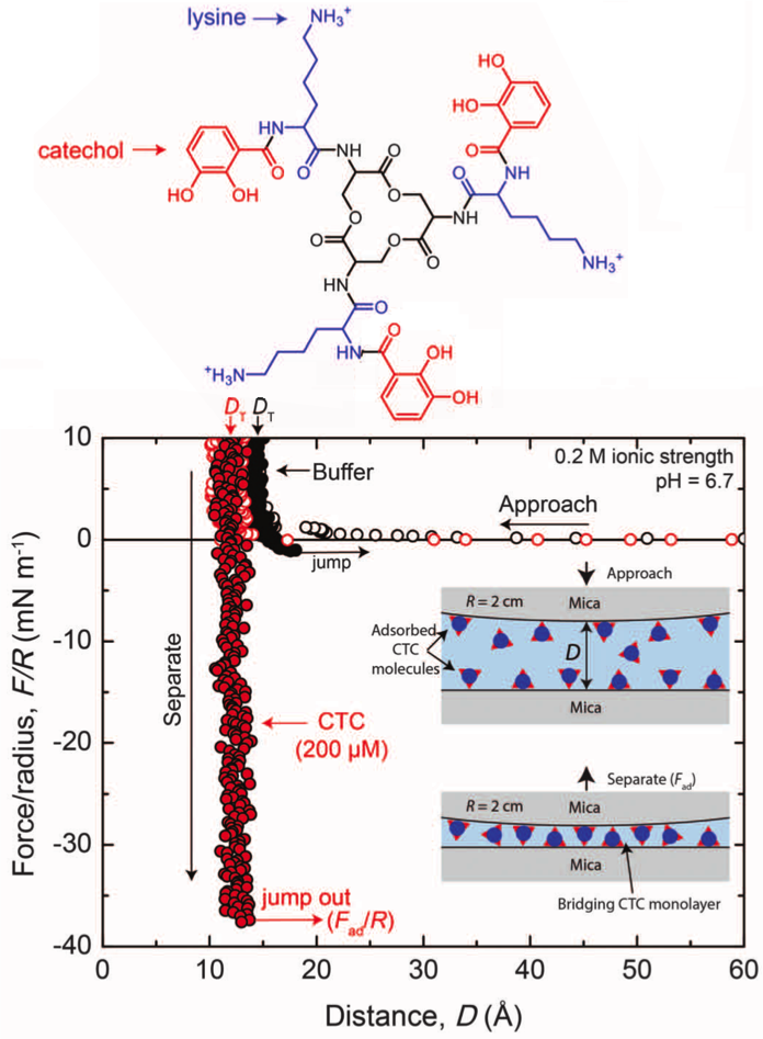 Siderophores appear to synergistically employ catchecol and lysine functionalities to adhere to hard oxide (minerals such as mica) surfaces, as verified using the surface forces apparatus (force-distance traces shown at right). The key molecule cyclic trichrysobactin (a siderophore, abbreviated CTC) is displayed alongside, with the catechol and lysine moieties indicated.