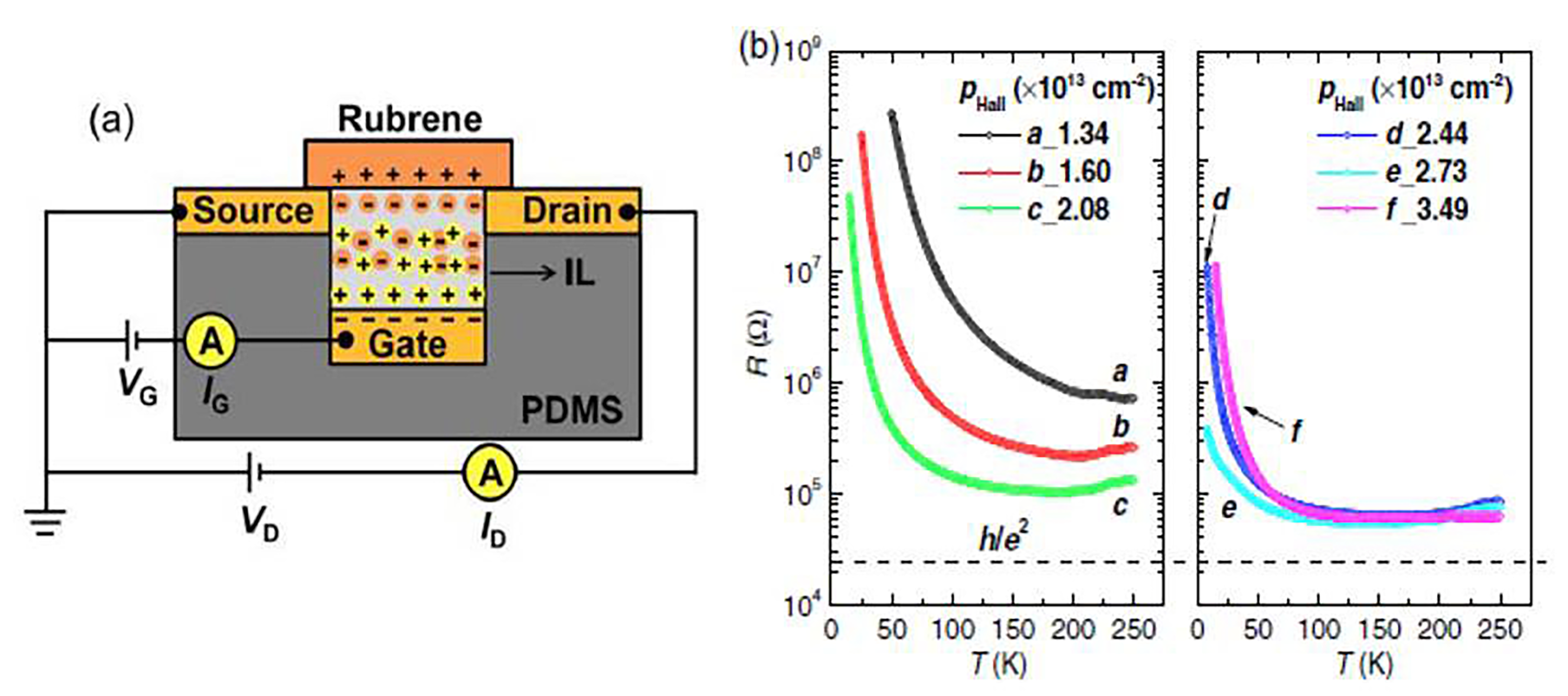 Whether metallic behavior can exist in 2D materials is a question that has troubled condensed matter physics for decades. Although originally thought impossible, evidence for such in ultra-clean high-purity doped inorganic semiconductor heterostructures based on materials such as Si and GaAs eventually changed the prevailing view. Research performed in IRG-1 using an approach to doping known as electrolyte gating has now shown that highly conductive (close to metallic) behavior can also be seen in 2D in an organic semiconductor, rubrene. This was enabled by techniques, based on the use of ionic liquids, that increase the density of holes on the surface by a thousand times over prior work. The mobility of the holes in rubrene remains far lower than inorganic semiconductors, however, raising perplexing questions about the fundamental origin of the conductive state.