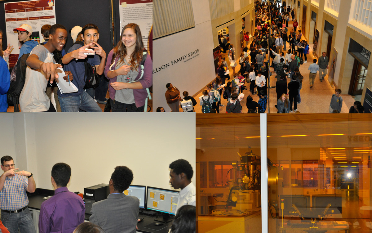 On May 20, 2015, over 250 middle and high school students participated in the inaugural MRSEC Research Experiences for Teachers (RET) Student Expo. The Expo extends the impact of the MRSEC RET program beyond participating teachers to their students via direct interaction with UMN researchers. During the school year, a secure website was set up to allow students to ask questions of the same researchers who mentored their teachers during the summer at UMN. After successful completion of the classroom research experience, the students were invited to the UMN campus to present their work in person via the Student Expo Poster Session. A full day of activities was planned leading up to the poster session, which included an admissions presentation, scientific demonstration show, and tours of the Minnesota Nano Center, Valspar Materials Lab, and seven faculty laboratories.