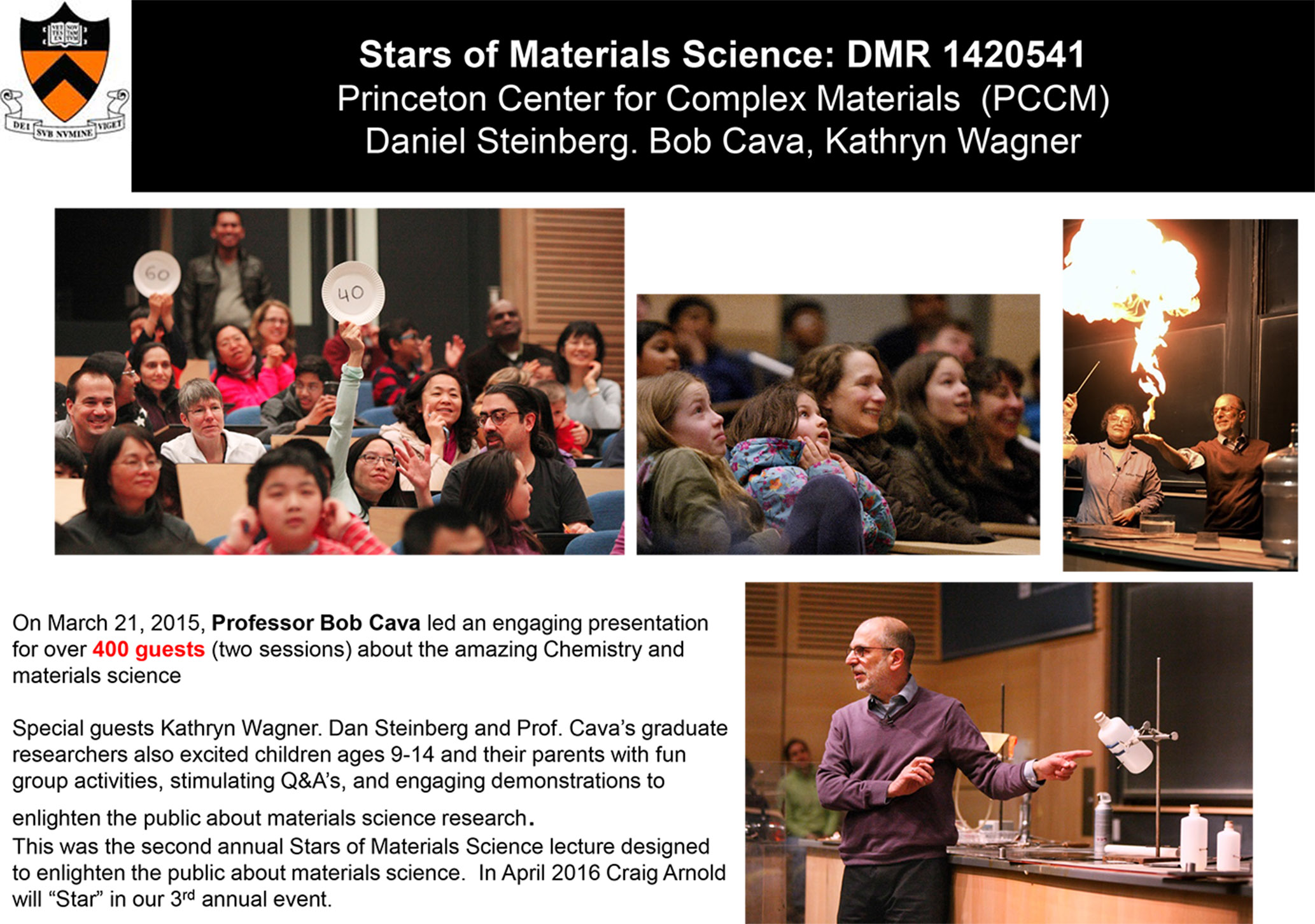 The was the second annual "Stars of Materials Science" event designed to engage and enlighten the public about materials science. In April 2016, Professor Craig Arnold will host PCCM's third annual "Stars of Materials Science" at Princeton.