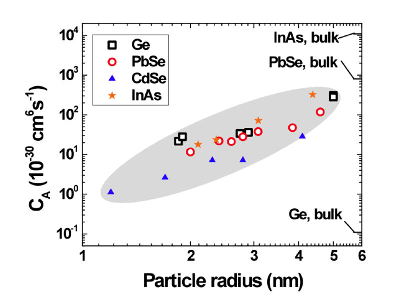 Auger recombination is an important mechanism that can limit the performance of solar cells. Ryan Gresback, working with a group at Los Alamos National Lab, compared Auger recombination rates of direct and indirect band gap semiconductor quantum dots. While in bulk semiconductors Auger recombination rates differ by 4-5 orders of magnitude, a striking convergence of Auger recombination rates in quantum dots of both direct (InAs, PbSe, CdSe) and indirect band gap (Ge) semiconductors was found.