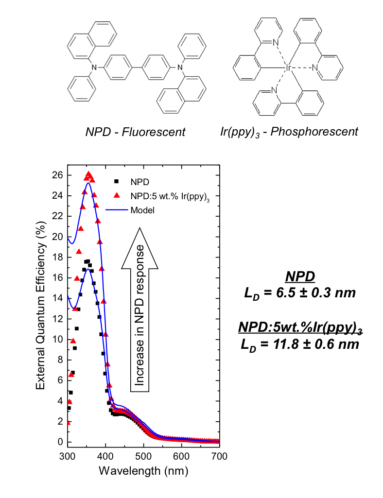 Graduate student Wade Luhman has demonstrated a route to enhance the short exciton diffusion length (LD) of organic semiconductors by combining fluorescent and phosphorescent materials into a single electron donating thin film. Here, a near-doubling of the diffusion length is realized in a fluorescent material upon addition of the phosphorescent sensitizer. This work highlights a novel approach to improve the absorption efficiency of organic solar cells, and provides fundamental insight into exciton migration in these materials.