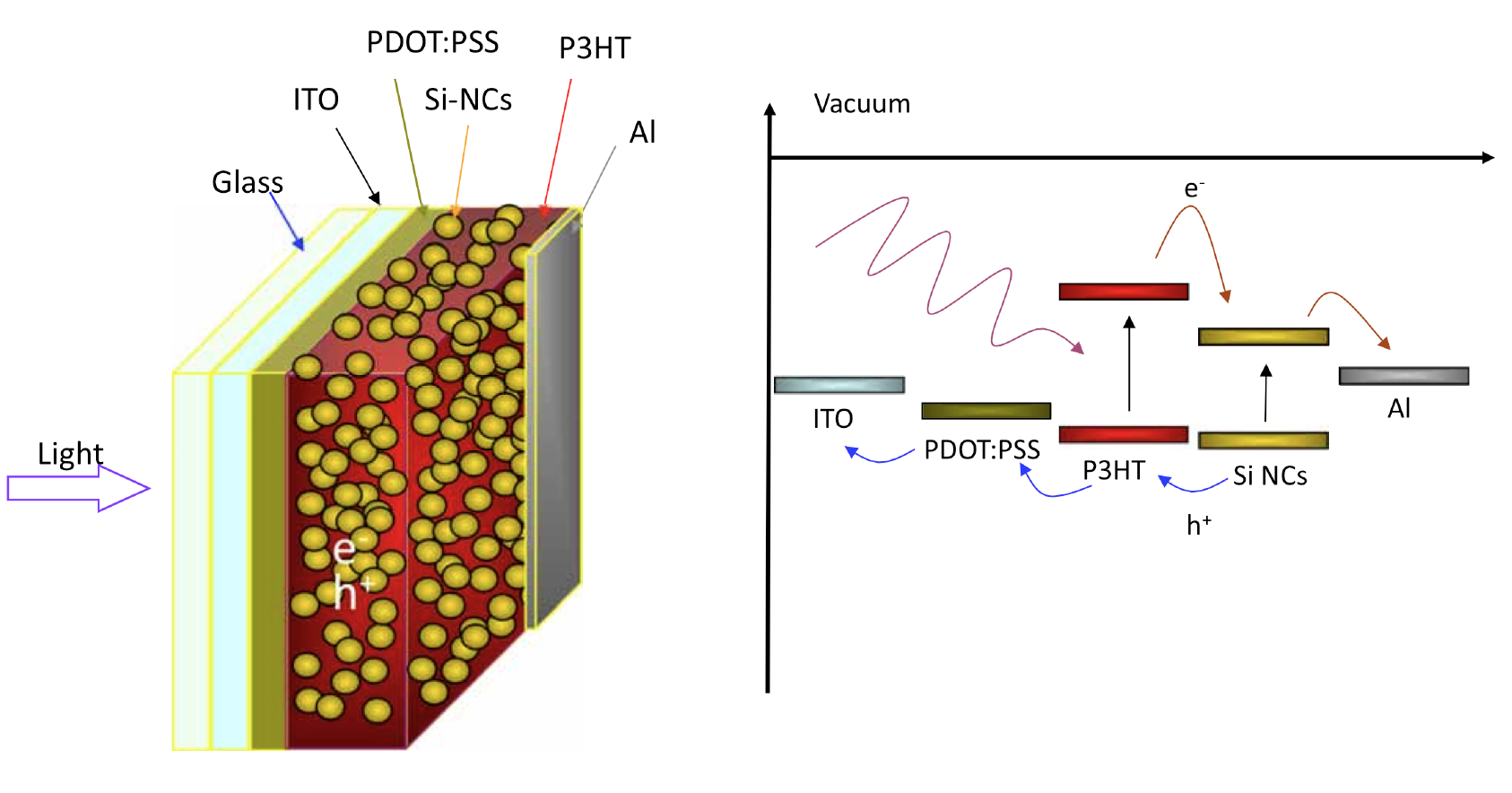 Mr. Chin-Yi Liu, a graduate student working in Professor Kortshagen’s group, demonstrated the first hybrid solar cell based on silicon nanocrystals and a conductive polymer, poly-3(hexylthiophene) (P3HT). The solar cell utilizes a blend of silicon nanocrystals between 3-10 nm in diameter and the organic semiconductor P3HT. Solar radiation is absorbed either by the polymer or by the silicon nanocrystals and produces an excited electron which is bound to the so-called hole, a missing electron left behind by the excitation process. In Mr. Liu’s solar cell, such electron-hole pairs are separated, as electrons tend to transfer to the silicon crystals while holes transfer to the polymer. After being separated, both types of charge carriers then travel to their respective electrodes either in the network of abutted silicon nanocrystals or in the polymer, which produces a useable current. Hybrid organic-inorganic solar cells such as Mr. Liu’s are intensely studied since they have the potential for ultra-low cost manufacturing. While the concept is not new, Mr. Liu’s research is the first that demonstrates the use of abundant, non-toxic and environmentally benign silicon nanocrystals.