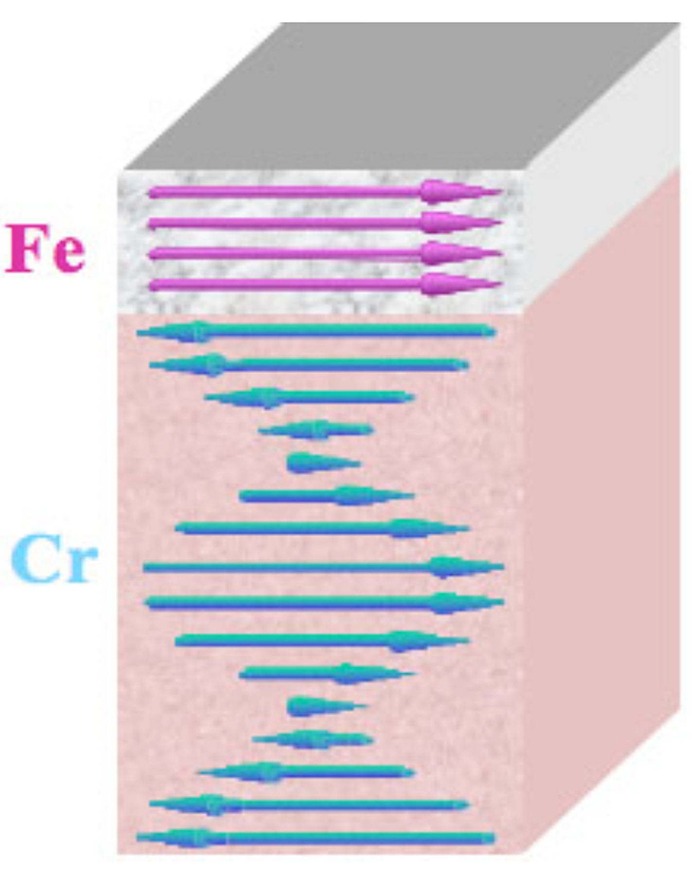Magnetism in metallic films and interfaces has been intensively studied since the discovery of Giant MagnetoResistance (GMR) in the late 1980s. This effect enabled fabrication of high sensitivity magnetic field sensors for the read heads in magnetic hard disks, revolutionizing magnetic recording. GMR occurs in structures where an ultra-thin "non-magnetic" film is sandwiched between two magnets, Fe / Cr / Fe being a popular example. Although often ignored, the weak magnetism of the Cr film is fascinating in its own right. As in all magnets, this magnetism originates from the arrangement of the spin magnetic moments of the electrons. Cr has one of the most extraordinary spin arrangements that can be found in the entire periodic table. The spins form a structure that is referred to as an antiferromagnetic Incommensurate Spin Density Wave. As shown in the figure, this involves a periodic modulation of the Cr spin, with a wavelength that does not match (i.e. is incommensurate with) the atomic periodicity. IRG3 postdoc Jeff Parker, working with graduate student Lan Wang, undergraduate Kim Steiner, and Professors Leighton and Crowell have used a well-known effect in thin film magnetism to directly probe this spin structure even in very thin films where other techniques cannot be applied. The work is based on the concept of interfacial exchange coupling between neighboring layers, using an effect called exchange bias. Exchange bias is an easily measurable perturbation of the properties of a ferromagnetic film due to proximity to an antiferromagnet like Cr. Its great sensitivity to the interface spins in the antiferromagnet means that in Fe/Cr thin film layers one can use the exchange bias in the Fe to probe the spin arrangement in the Cr. In particular, the wavelength of the Cr spin density wave varies with temperature, leading to an oscillation in the Cr surface spin magnitude, and therefore an oscillation in the strength of the coupling to the Fe, with temperature. By measuring these oscillations they were able to determine, in a unique way, important and detailed information on the spin density wave, such as the extent of the wavelength change with temperature, and the critical temperatures at which the nature of the spin density wave changes. The experiment required not only the fabrication of high crystalline perfection epitaxial Fe/Cr films (with very smooth interfaces) but also measurement of the exchange coupling strength to very high accuracy due to the small magnitude of the oscillations.