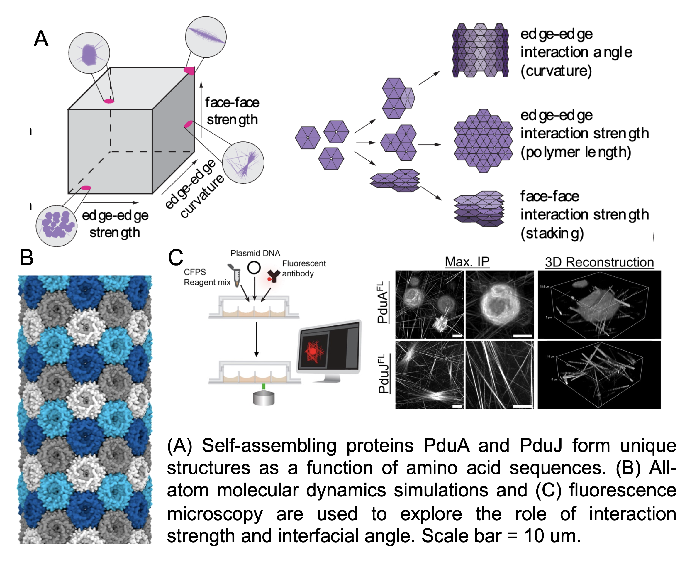 Northwestern University IRG-1 has identified novel protein building blocks that form high-aspect ratio structures with genetic-level programmability and tunability. For example, one building block gives rise to structures up to hundreds of microns in length yet only 20 nanometers in diameter, while another gives rise to regular hexagons of up to 40 microns in diameter but only 10 microns thick. These features are tuned by single amino acid mutations in the building block, which impact charge and size of the protein at key interfaces.