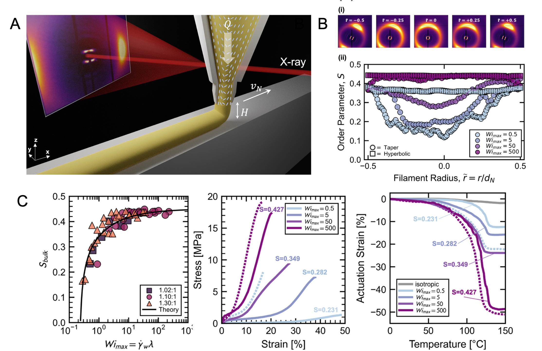 Aligned liquid crystal elastomers (LCEs) are soft materials that exhibit reversible actuation akin to human muscles when thermally cycled above their nematic-to-isotropic transition temperature. Lewis and collaborators studied the effects of LCE ink composition, nozzle geometry, and printing parameters on director alignment. By combining rheological measurements, in-operando microbeam X-ray scattering, and simulation, we show that the dimensionless Weissenberg (Wi) number, which characterizes ink flow through tapered and hyperbolic nozzles, directly correlates with director alignment in printed LCE filaments. By altering the value of Wi on-the-fly during printing, one can fabricate monolithic LCE actuators with spatially programmable alignment, stiffness, and actuation strains.