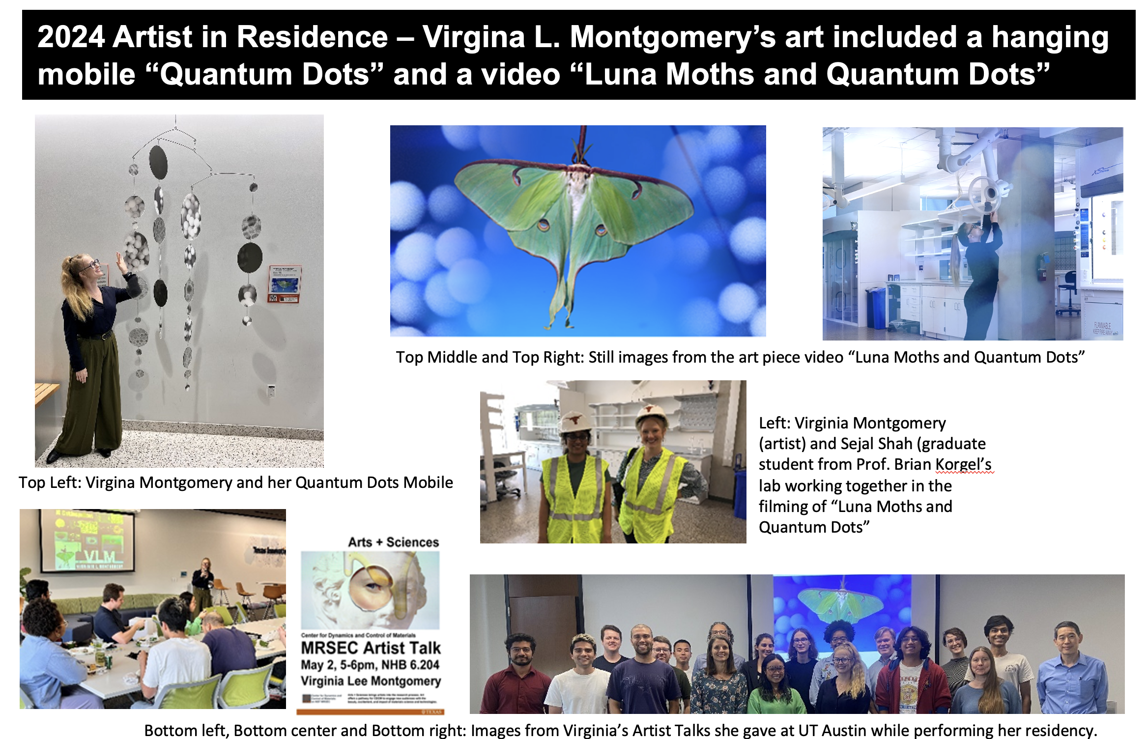 Virginia Lee Montgomery was funded as the CDCM Artist in Residence during 2024. She works with video, sculpture, performance, and sound and her artwork is a practice of metaphysics, latently autobiographical, often with a feminist impulse. Virginia was embedded in Prof. Brian Korgel’s lab studying quantum dots and hosted two artist talks while at CDCM. She produced a hanging mobile and video showcasing CDCM research. The mobile hangs in one of the main common areas at the Engineering Education and Research Building at the University of Texas at Austin with a QR code linked to her video that hangs beside the mobile.