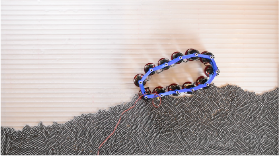 In this study, active solids were built out of centimetre-scale building blocks that perform adaptive locomotion. These prototypes exhibit a non-variational form of elasticity characterized by odd moduli, whose magnitude was predicted from microscopics using coarse-grained theories validated experimentally.