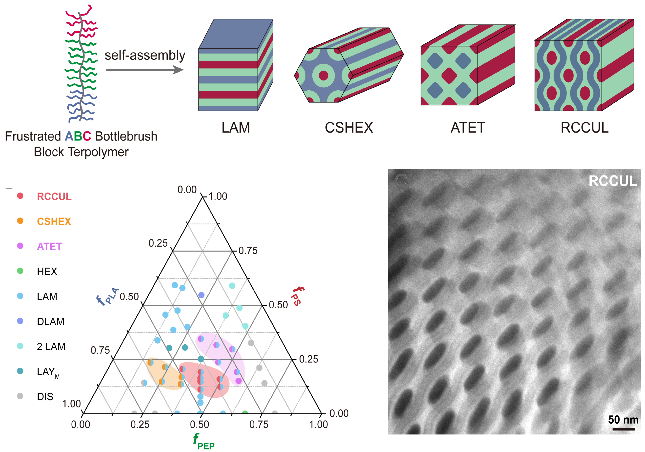 Morphological characterization in collaboration with the Bio-Pacific MIP at UC-Santa Barbara, revealed intriguing mesoscopic structures, including lamellae, core-shell hexagonally packed cylinders (CSHEX), alternating tetragonally packed cylinders (ATET), and an unprecedented morphology, rectangular-centered cylinders-in-undulating-lamellae (RCCUL). Molecular weight variations led to a range of unit cell dimensions (exemplified by RCCUL) from 40 to 130 nm.