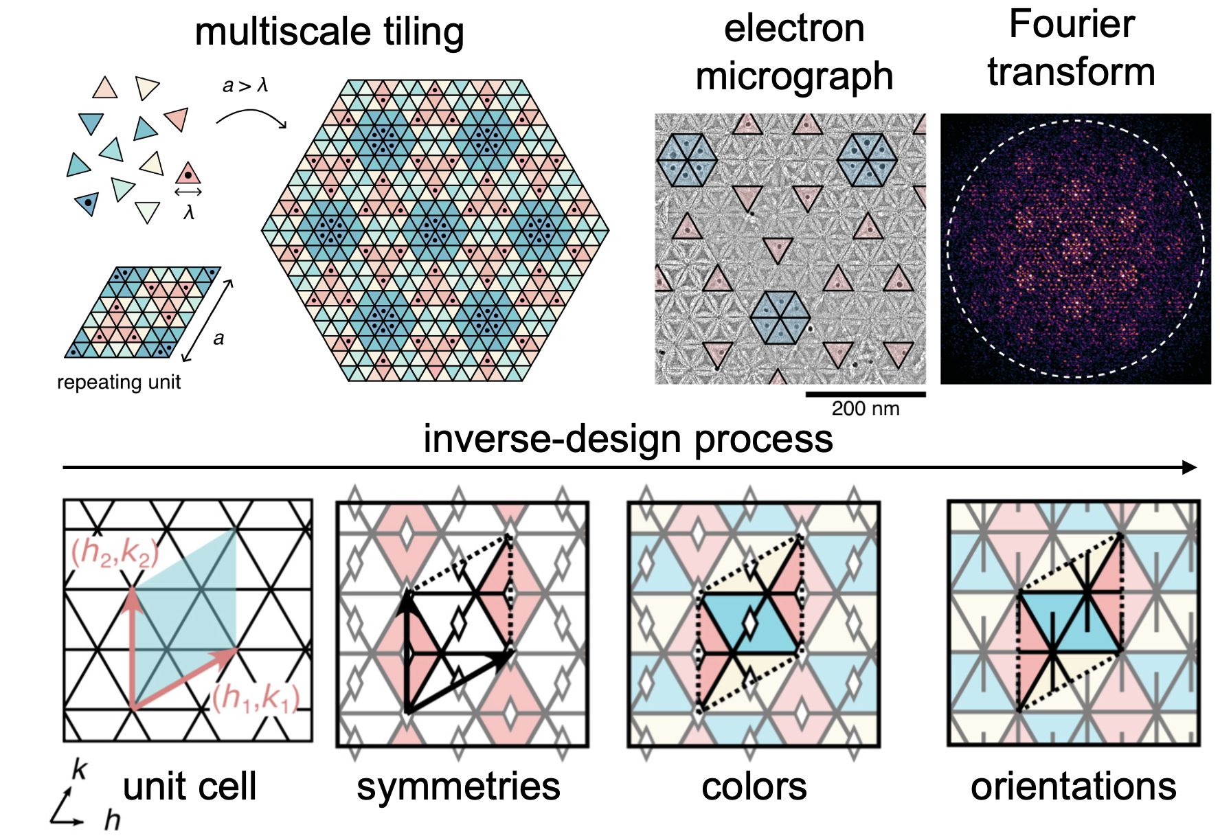 Triangular subunits with chemically specific interactions self-assemble into two-dimensional tilings with large unit cells comprised of many unique subunit species, which could find applications in photonics and plasmonics. New design algorithms show how to define the mutual interactions between the various particle species to produce a user-specified complex crystal with a multicomponent unit cell by exploiting symmetry.