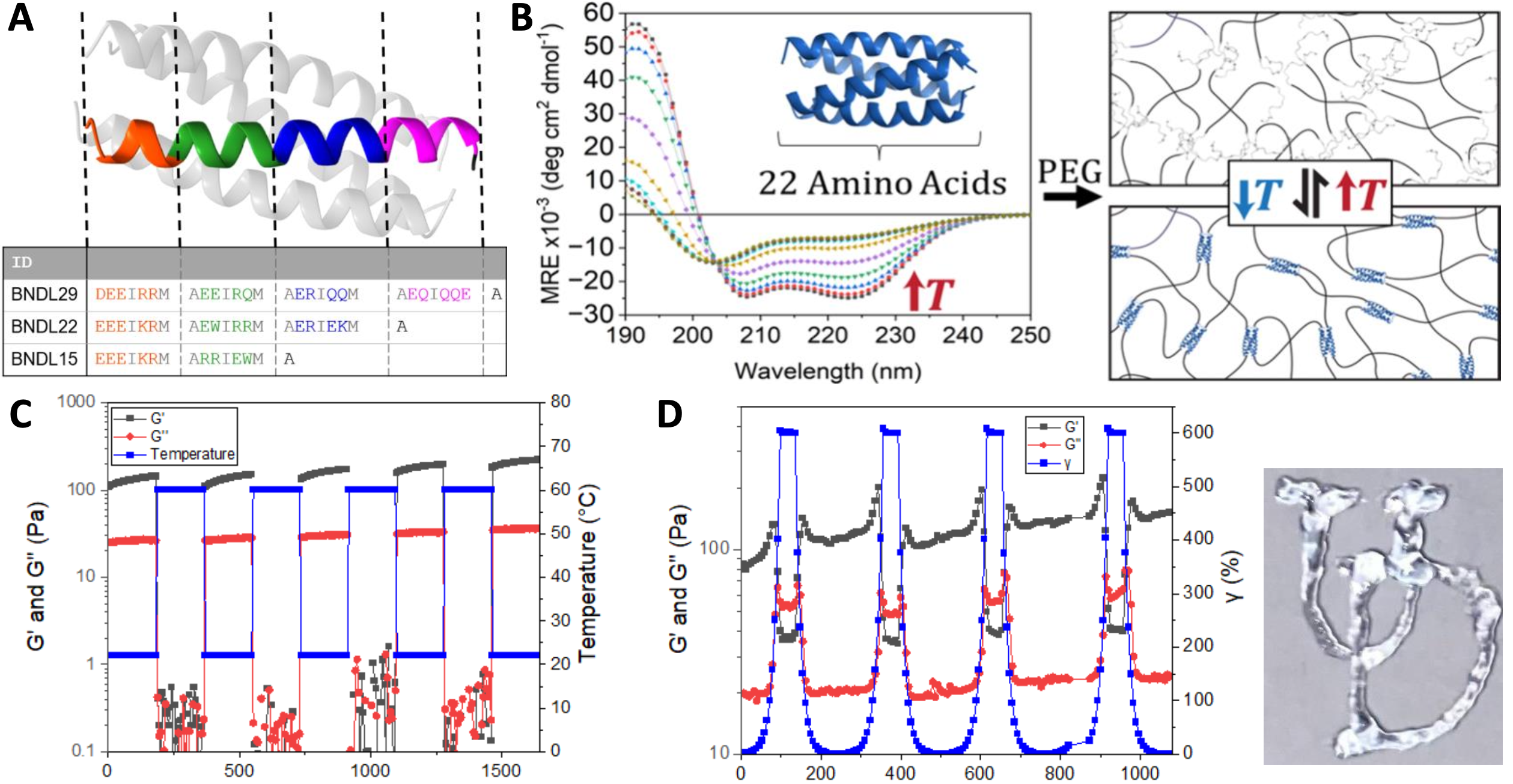 BNDL22 was incorporated within hydrogels as a thermoresponsive and shear-thinning cross-linker for reversibly cycling properties and enabling material processing for 3D printing and injectable applications.