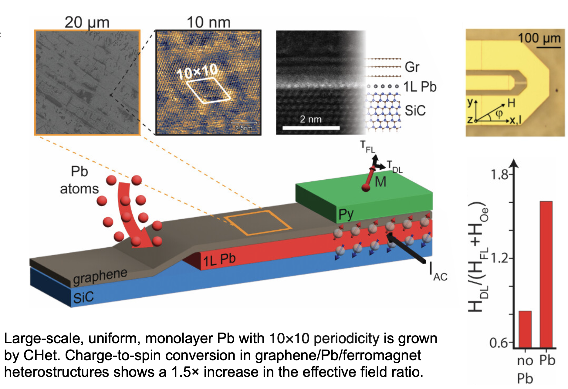 Intercalation of air-stable monolayer Pb into EG/SiC by confinement heteroepitaxy (CHet) enables study of heavy metal films at the extreme limit of thinness with complementary microscopy and spectroscopy. Pb coverages up to 90% can be achieved at elevated temperatures beyond those of conventional ultrahigh vacuum methods. CHet-based Pb exhibits a Frenkel- Kontorova domain boundary network due to lateral compressive stress relief within a (1 × 1) Pb/SiC model, which can be seen experimentally as a (10 × 10) superstructure. Anticipating a large spin polarizability, we leverage uniformly intercalated Gr/Pb/SiC as a basal layer for a ST-FMR measurement, discovering a 1.5× increase in the effective field ratio over a hydrogenated sample and consistency with C3v symmetry. Intercalation of Pb in EG/SiC is thus a promising material platform for ex situ spin transport phenomena.
