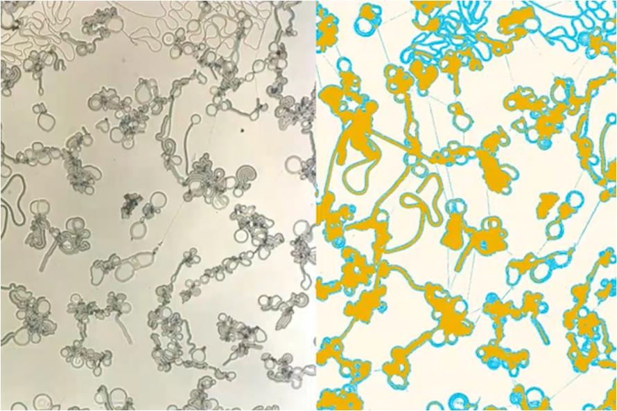 When cooling a mixture of liquid crystal molecules and solvent, the liquid crystals don't form typical spherical droplets. Instead, they create elongated filaments that grow, buckle, and collapse into interconnected networks. This behavior is driven by a competition between elastic forces within the liquid crystal and surface tension, creating dynamic self-driven assembly that mimics aspects of living systems.