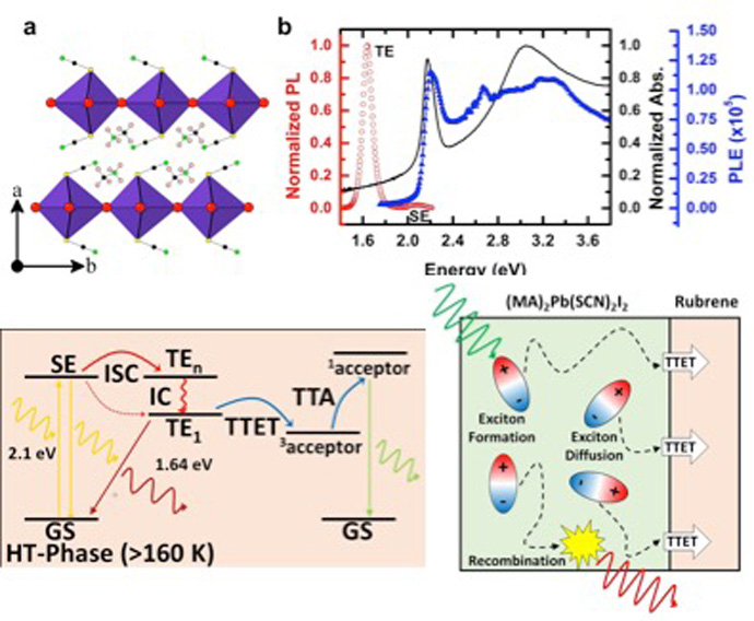 Most recent work on hybrid organic-inorganic perovskites is focused on solar cell applications. Hybrid perovskites, however, provide a flexible platform for materials design, with prospects for many different applications. MAPb(SCN)2I2 is a 2D layered perovskite structure, with thiocyanate anions replacing some of the halide ions from the standard structure. Interestingly, optical absorption in this material results in triplet exciton generation with high efficiency. We show that these triplet excitons can diffuse across the material for about 150 nm and can be collected by a triplet acceptor molecule adsorbed on the surface. Moreover we observe annihilation of triplet excitons to form singlets in the upconverting molecules. These observations suggest perovskites may be used in applications such as triplet sensitizers and singlet oxygen generation for photodynamic therapy.