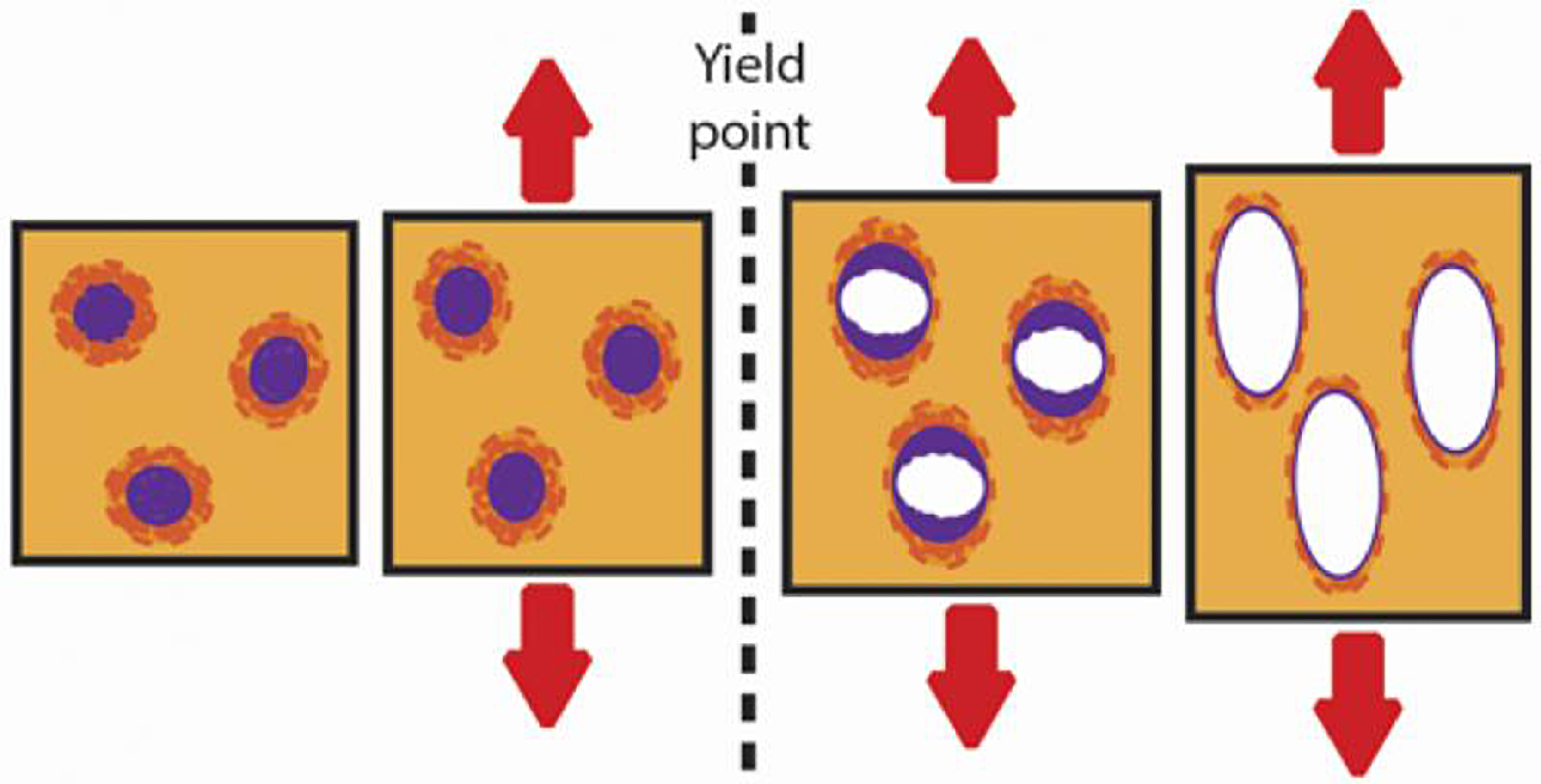 Addition of rubber particles to epoxy thermosets has been successful for toughening these brittle materials. However, a complete description of the toughening mechanisms is still elusive. Of particular interest is understanding the enhanced toughness achieved upon adding small amounts of block copolymers to commercial epoxy resins. Simultaneous small-angle X-ray scattering (SAXS) and tensile experiments were performed on epoxies modified with 30 nm diameter rubbery and glassy core block copolymer micelles. The SAXS data revealed efficient cavitation of the spherical rubbery cores and absence of cavitation in the glassy nanodomains. These results are quantitatively anticipated by theory that accounts for cavitation in rubber toughened plastics as a function of particle size.