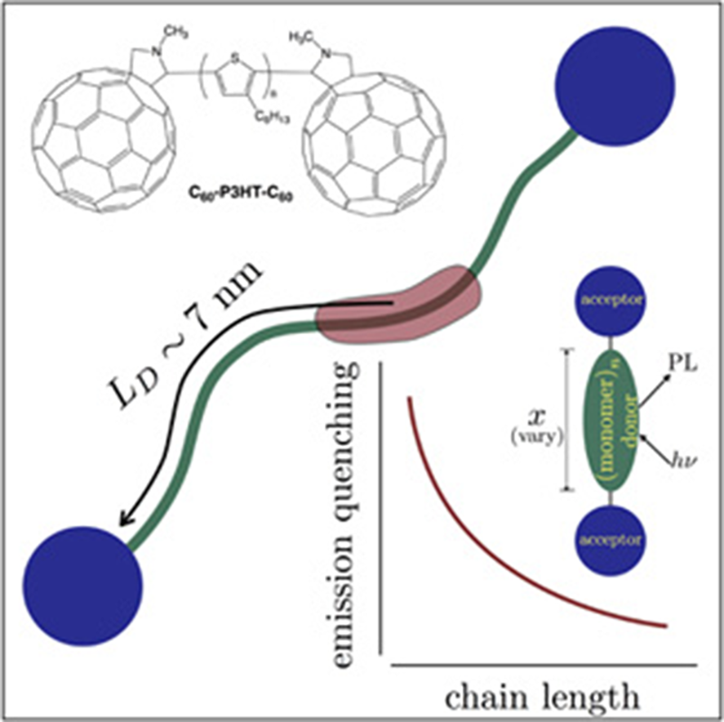 Using a series of acceptor-polymer-acceptor triads, IRG-2 investigators have measured intramolecular exciton diffusion in poly-3(hexylthiophene) (P3HT) for the first time. The results indicate that the transport is much more facile along the polymer chain than in ordered regions of thin films where intermolecular interactions trap the exciton. The intramolecular exciton diffusion length LD was found to be 7 nm. Exciton diffusivity was measured by determining the dependence of photo-luminescence quenching of C60-endcapped P3HT as a function of polymer chain length, followed by theoretical modeling. The results have implications for the use of P3HT (and other conjugated polymers) in organic solar cells.