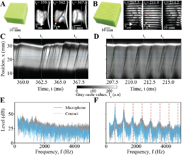 Squeaking often occurs when two bodies slide against each other, yet its mechanisms are not fully understood, especially at soft–rigid interfaces. Bertoldi, Weitz, and Rubinstein used high-speed imaging and acoustic analysis to reveal that, at squeaking velocities, opening pulses propagate at approximately the shear wave speed of the soft material and mediate local slip. For flat interfaces, these pulses are irregular and produce broadband sound emissions. However, adding thin surface ridges confines pulse propagation, stabilizing it into coherent, periodic pulse trains that generate tonal squeaking at a frequency set by the first shear mode of the block, demonstrating a structure-driven mechanism for controlling frictional rupture.